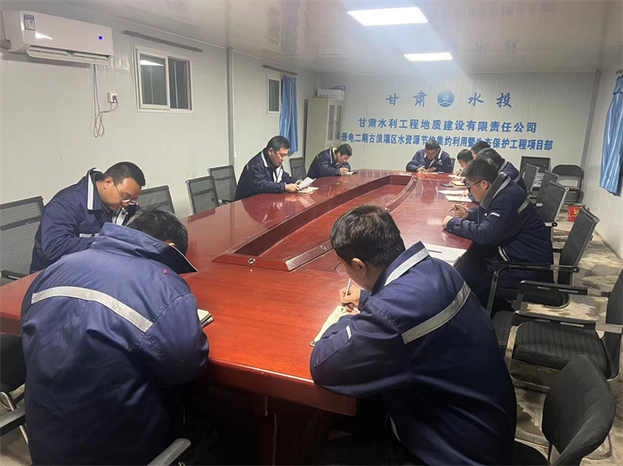 2024年2月27日,景电二期古浪灌区水资源集约节约暨生态保护工程2号水池项目成员已全部到岗,由分公司副经理、安全负责人主持召开复工复产安全会议,对项目全体成员的岗位工作进行了初步安排,并成立了安全小组和应急救援小组。安全小组成员先后对生活区灭火器、生活用电、厨房液化气瓶等进行了全面检查,并对I、II级调蓄水池坝顶、边坡、进水口、阀门、外围栏等重点部位,严格按照值班表轮流检查,切实营造“不安全不复工”的安全氛围,确保工程项目在复工复产过程中无事故、无隐患。